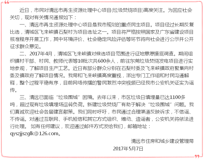 關(guān)于清城區(qū)飛來(lái)峽鎮(zhèn)石梨村清遠(yuǎn)市再生資源處理中心項(xiàng)目的情況通報(bào)